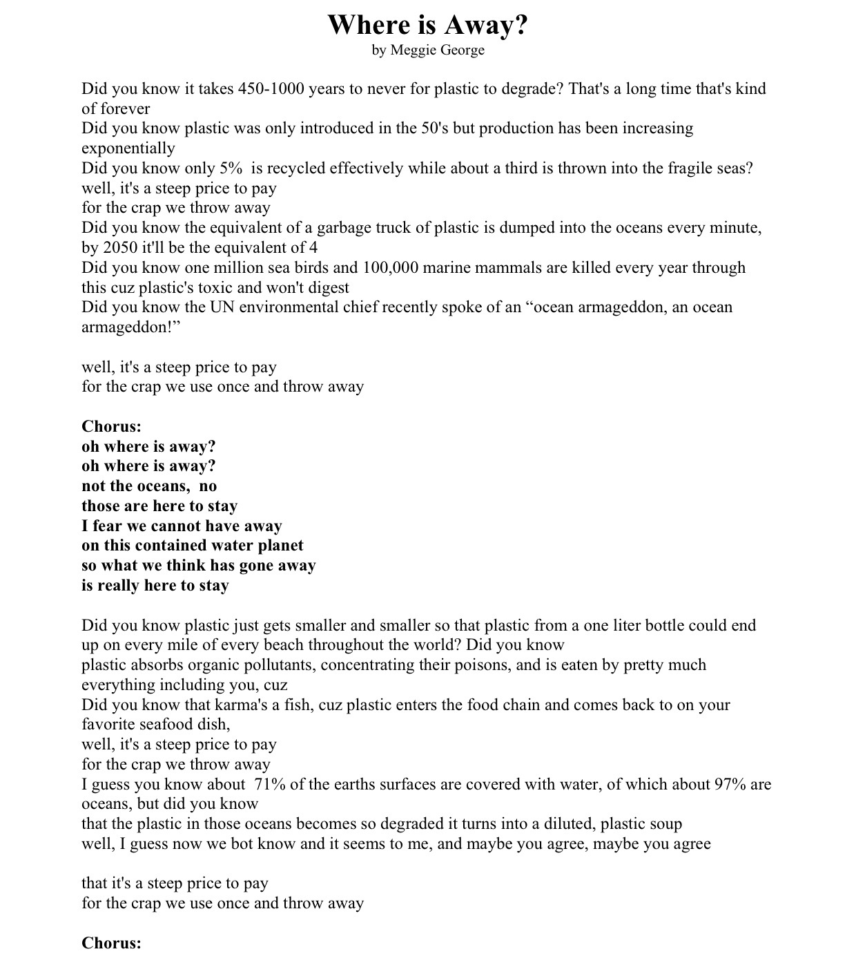 This first song is a song called “Where is Away?” It is a love song to the Oceans and a sad song about plastic pollution in those oceans (I know plastic pollution isn’t the only issue – but I don’t know how to write a song that covers everything)…